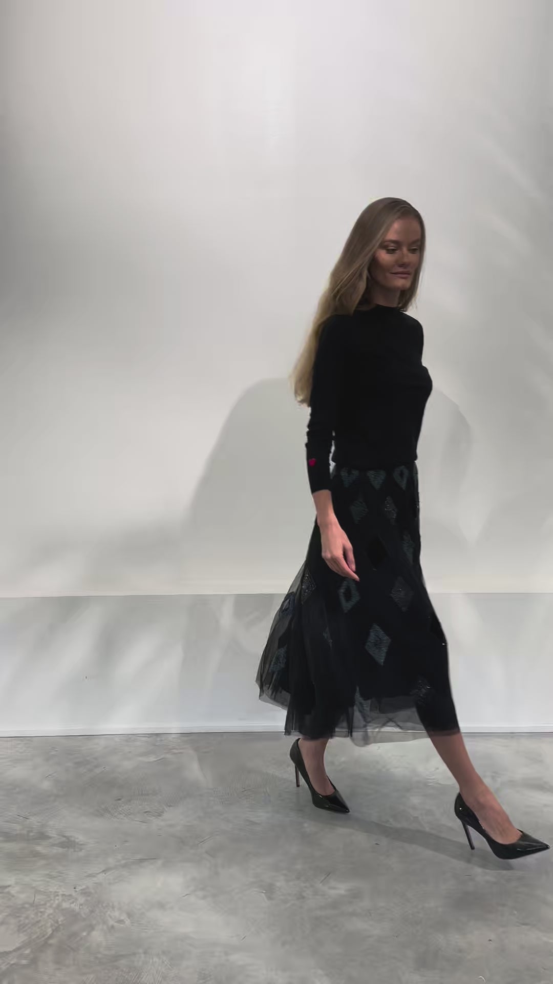 The skirt is 80 cm long. The model is 175cm tall.